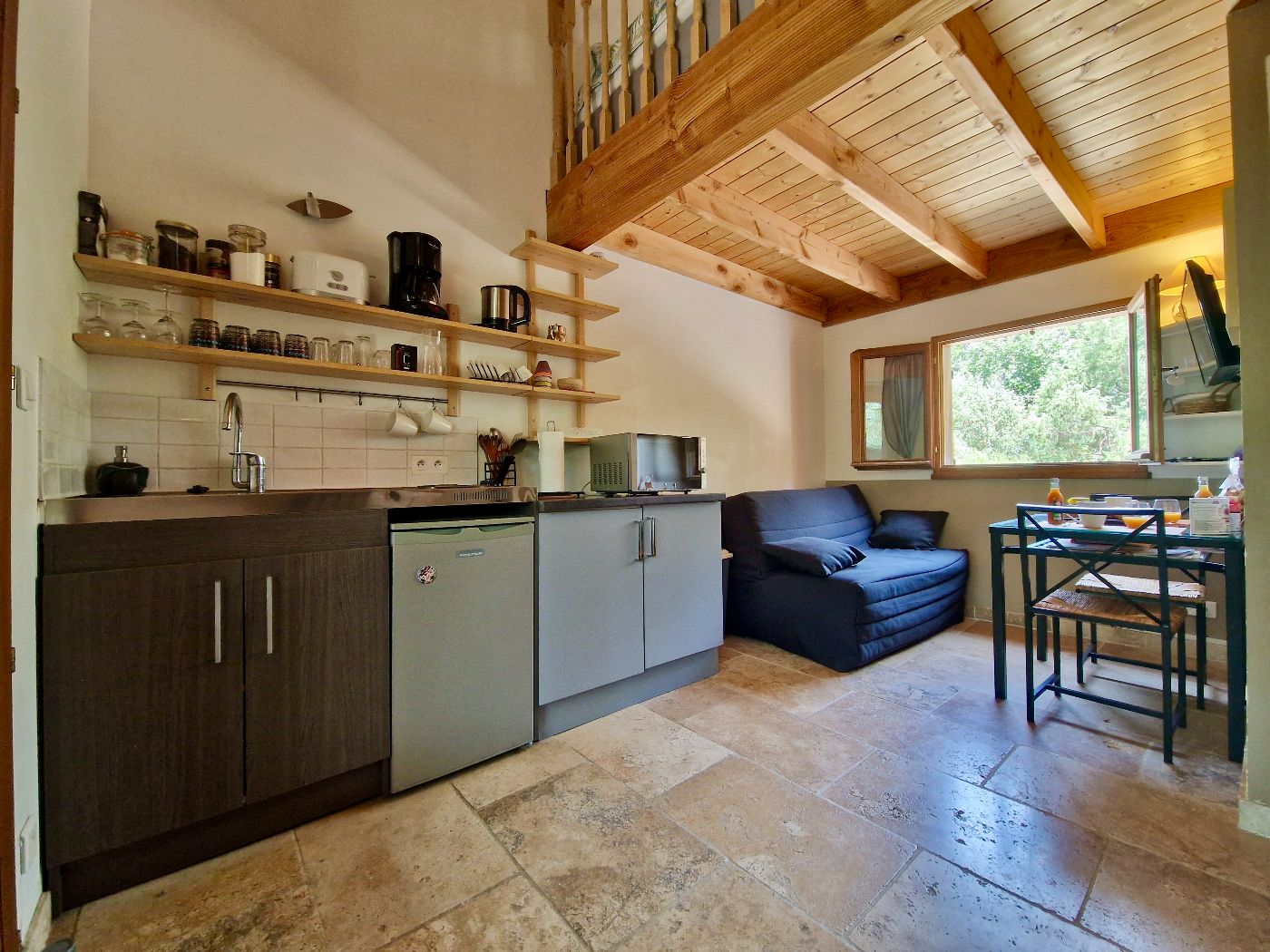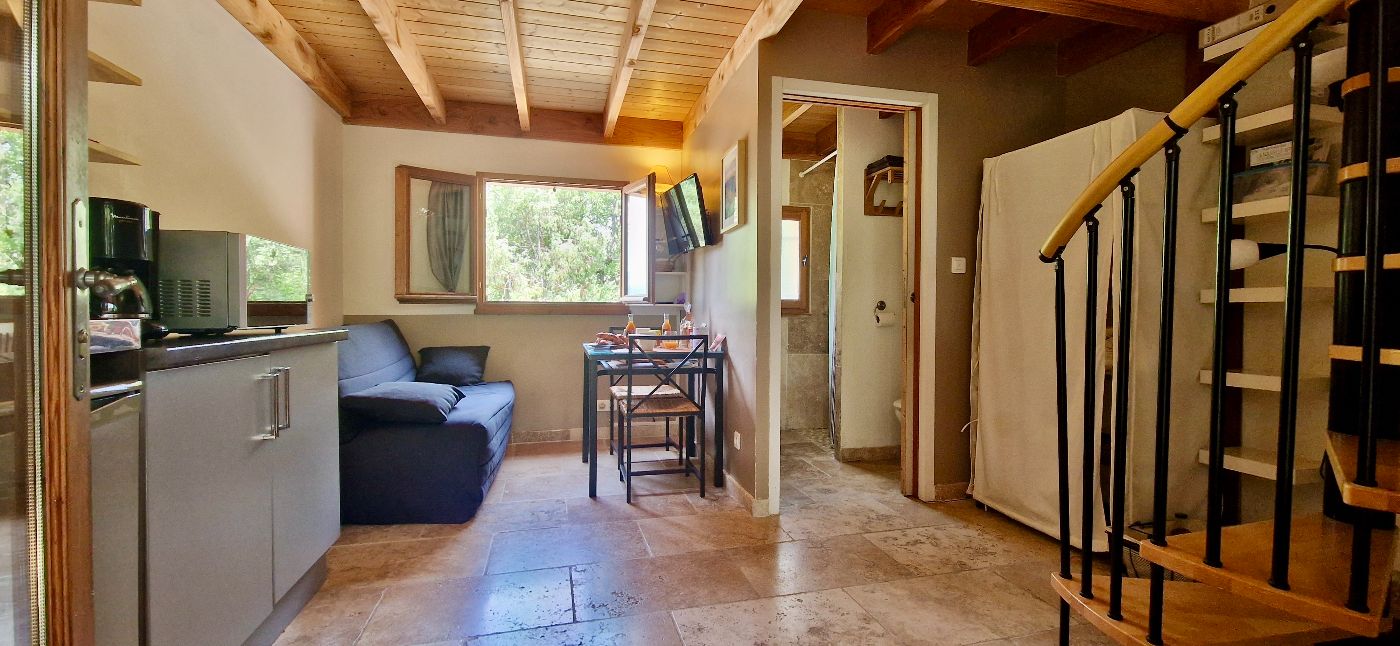 Votre séjour aura lieu dans ce charmant studio, construit en ossature bois. Ce mode de construction vous permettra d'apprécier la fraîcheur pendant l'été et un bien-être particulier en hiver.