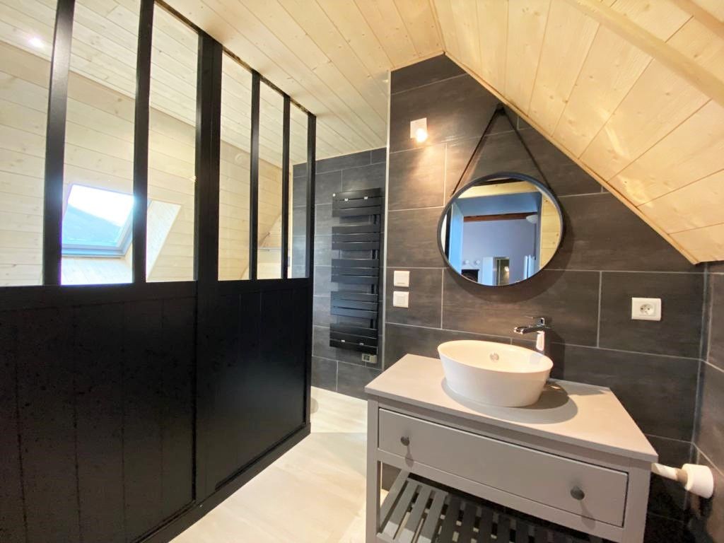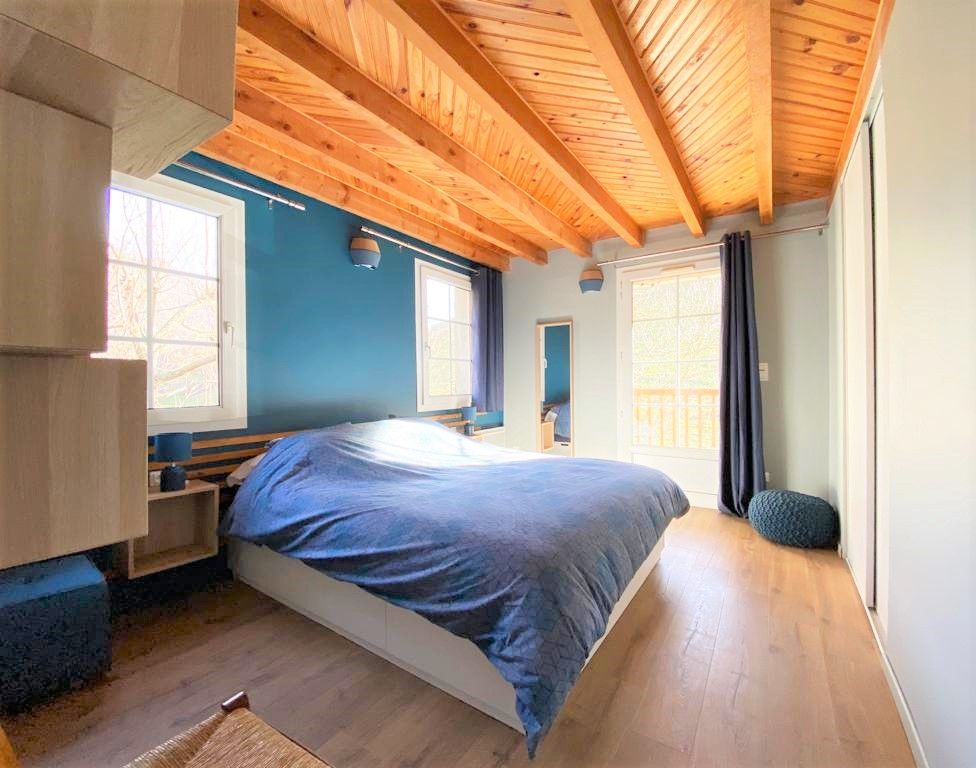 - Le rez de chaussée est espace commun: sas d'accès, grande pièce à vivre avec cheminée-salon-table à manger, cuisine entièrement équipée indépendante, le tout donnant sur terrasse de 50 m2 et jardin d'agrément, salle de bain et WC.