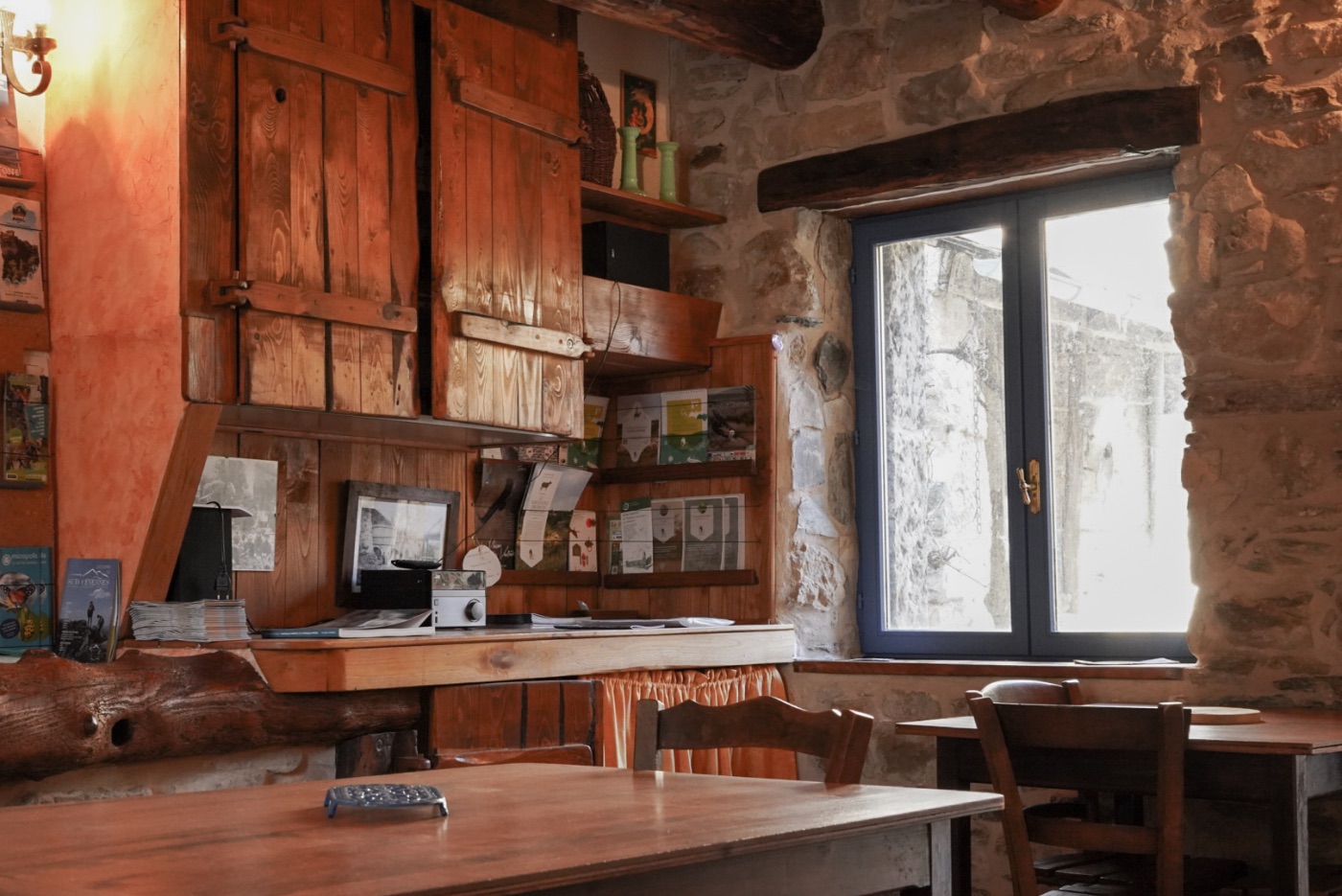 La grande salle de convivialité peut accueillir jusqu'à 25 personnes autour de la cheminée centrale.