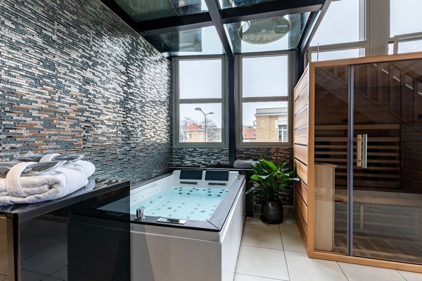 Détendez-vous et profitez pleinement de notre tout nouvel espace Spa haut de gamme, équipé d'un jacuzzi, d'un sauna avec son ciel étoilé et d'une douche tropicale pour un moment de pure relaxation.