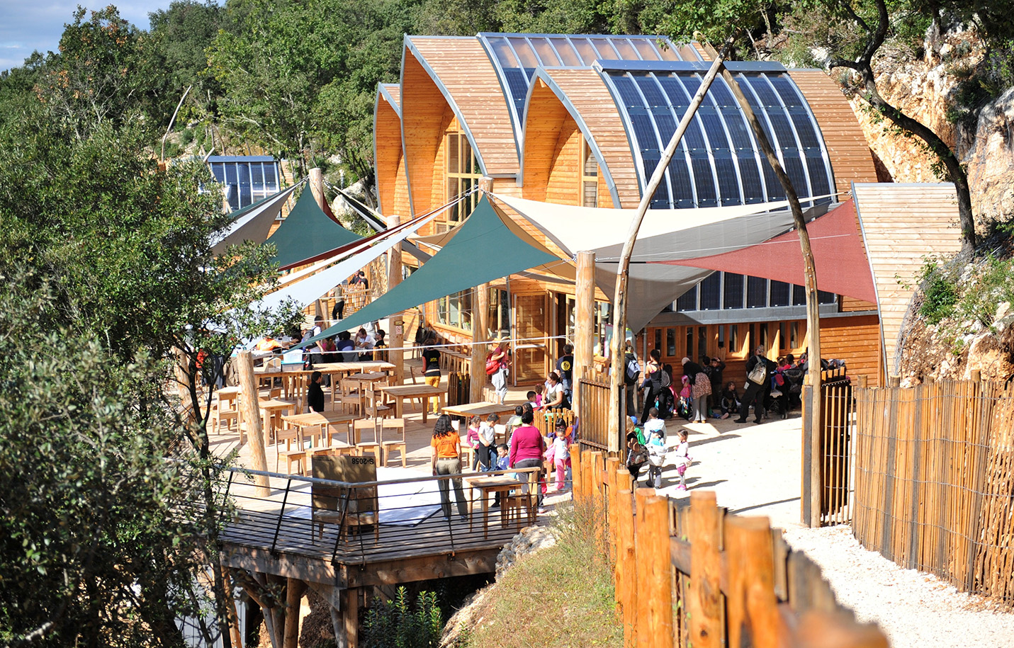 A l’extérieur, le site naturel est d’une grande beauté. Pour le préserver, les véhicules sont laissés à 700m (les visiteurs à mobilité réduite stationnent sur place) et c’est par un joli sentier ombragé que vous rejoindrez la structure d’accueil en bois local nichée à flanc de falaise, conçue par l’architecte Jean-François Daures. Celle-ci supporte les panneaux photovoltaïques qui permettent à la Grotte de la Salamandre d’être la première en Europe à être « éclairée par le soleil ».