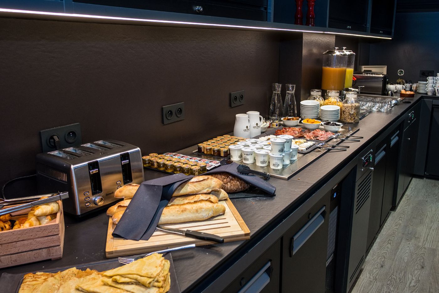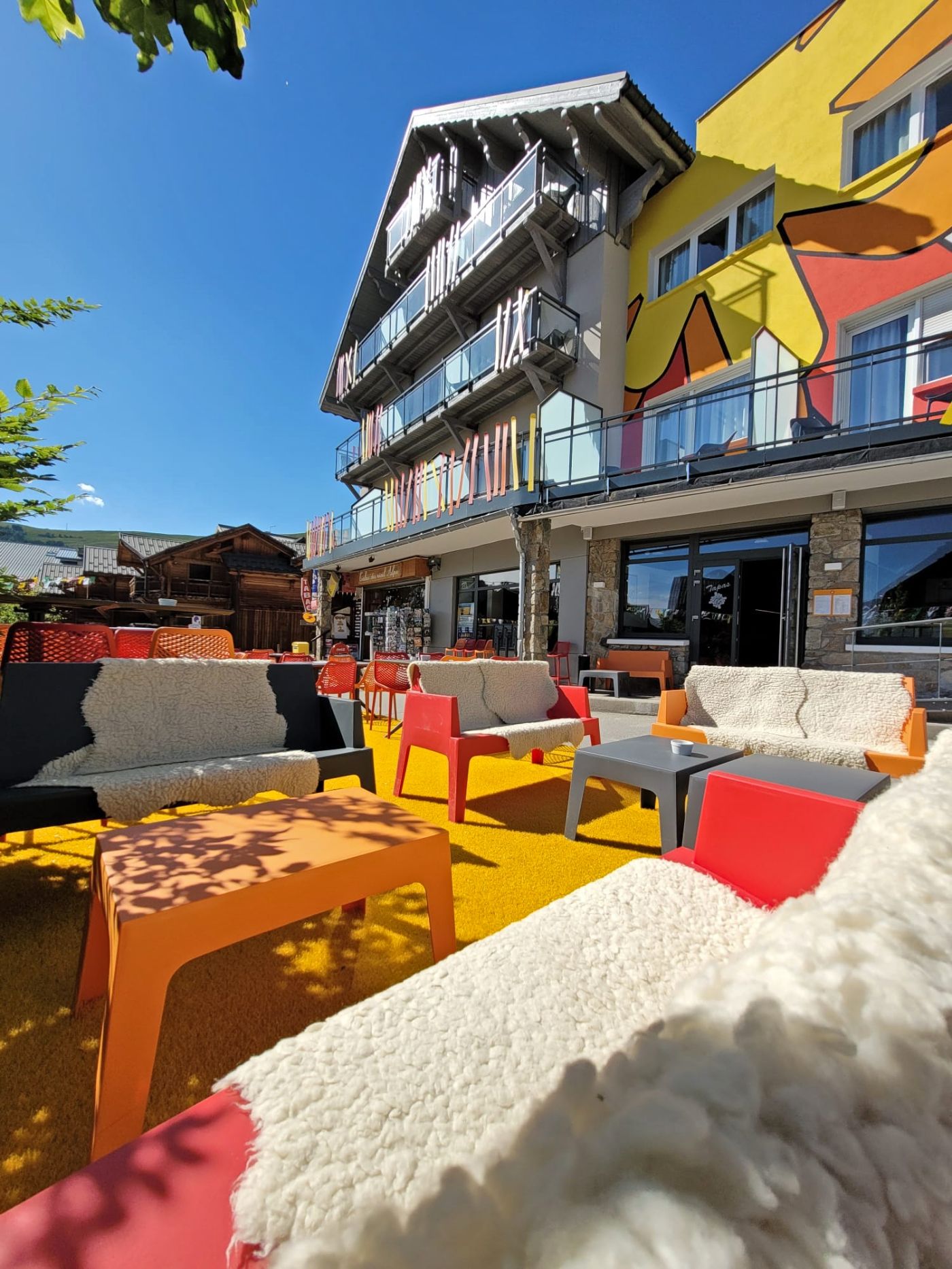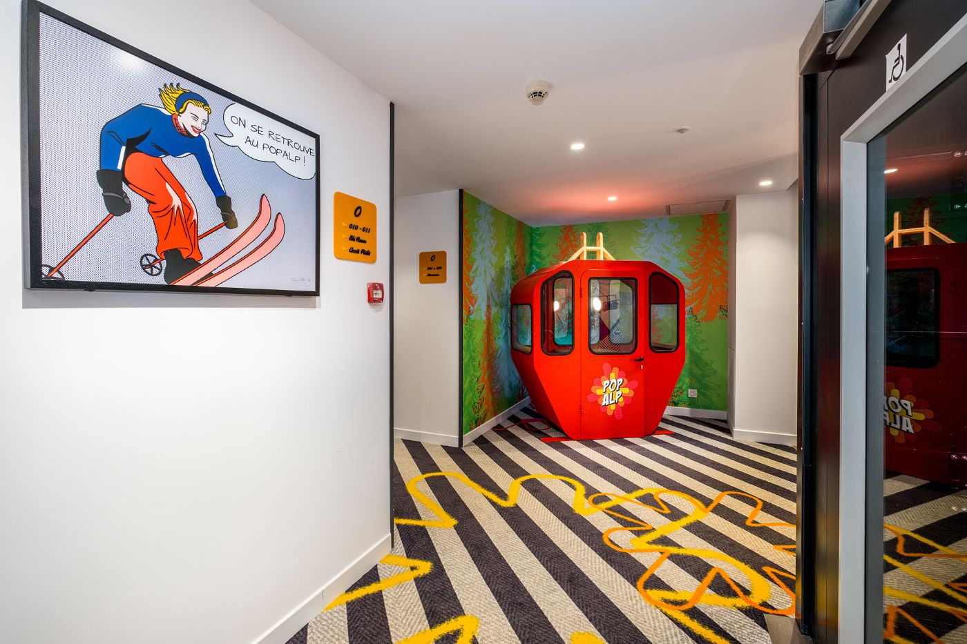 Notre salle de restauration, aux couleurs popart, vous accueille pour déjeuner de 12h00 à 14h00 et pour diner de 19h00 à 22h00. Vous pouvez aussi profiter d'une pause sucrée tout au long de la journée avec notre bar à crêpes.