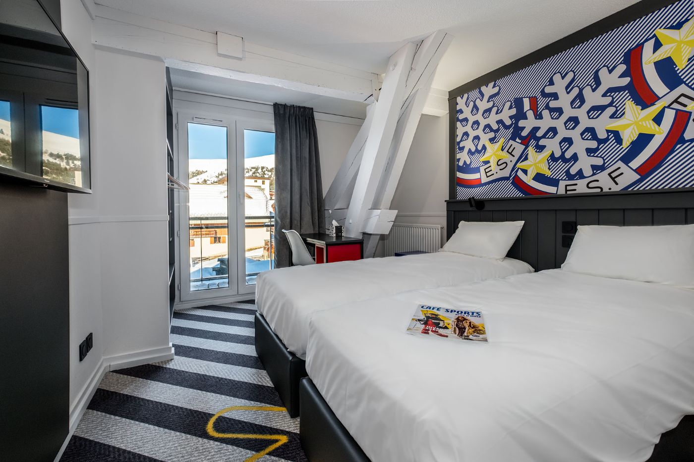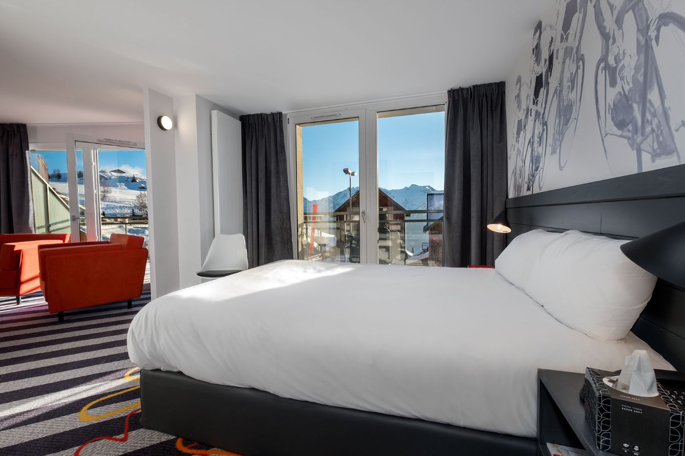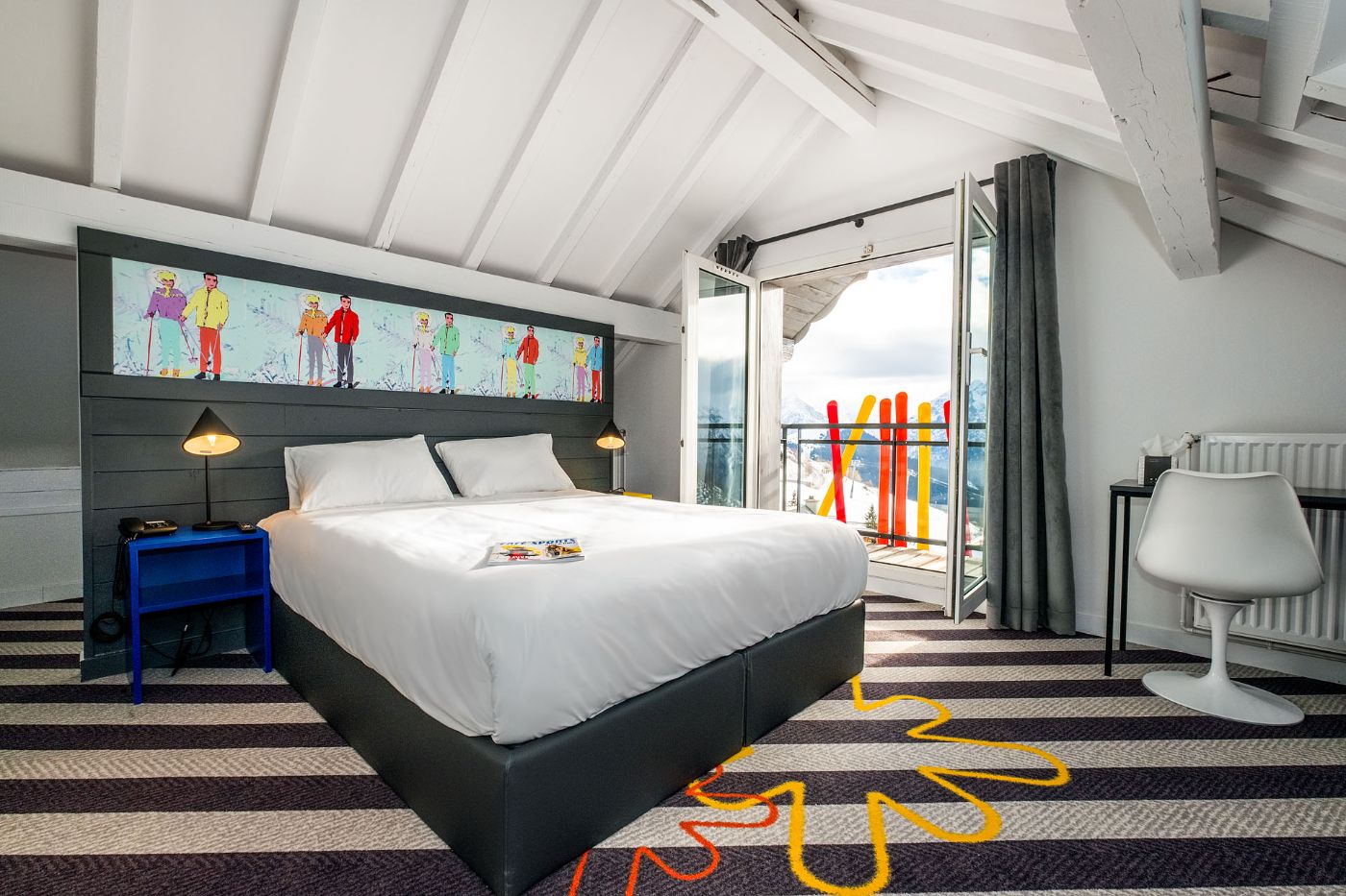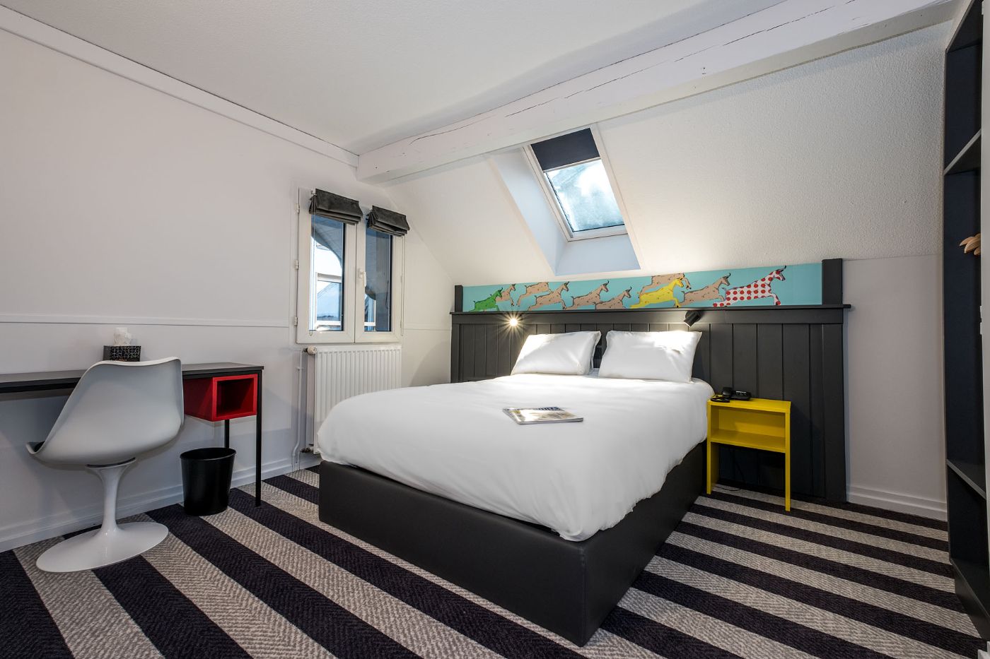 Notre salle de restauration, aux couleurs popart, vous accueille pour déjeuner de 12h00 à 14h00 et pour diner de 19h00 à 22h00. Vous pouvez aussi profiter d'une pause sucrée tout au long de la journée avec notre bar à crêpes.