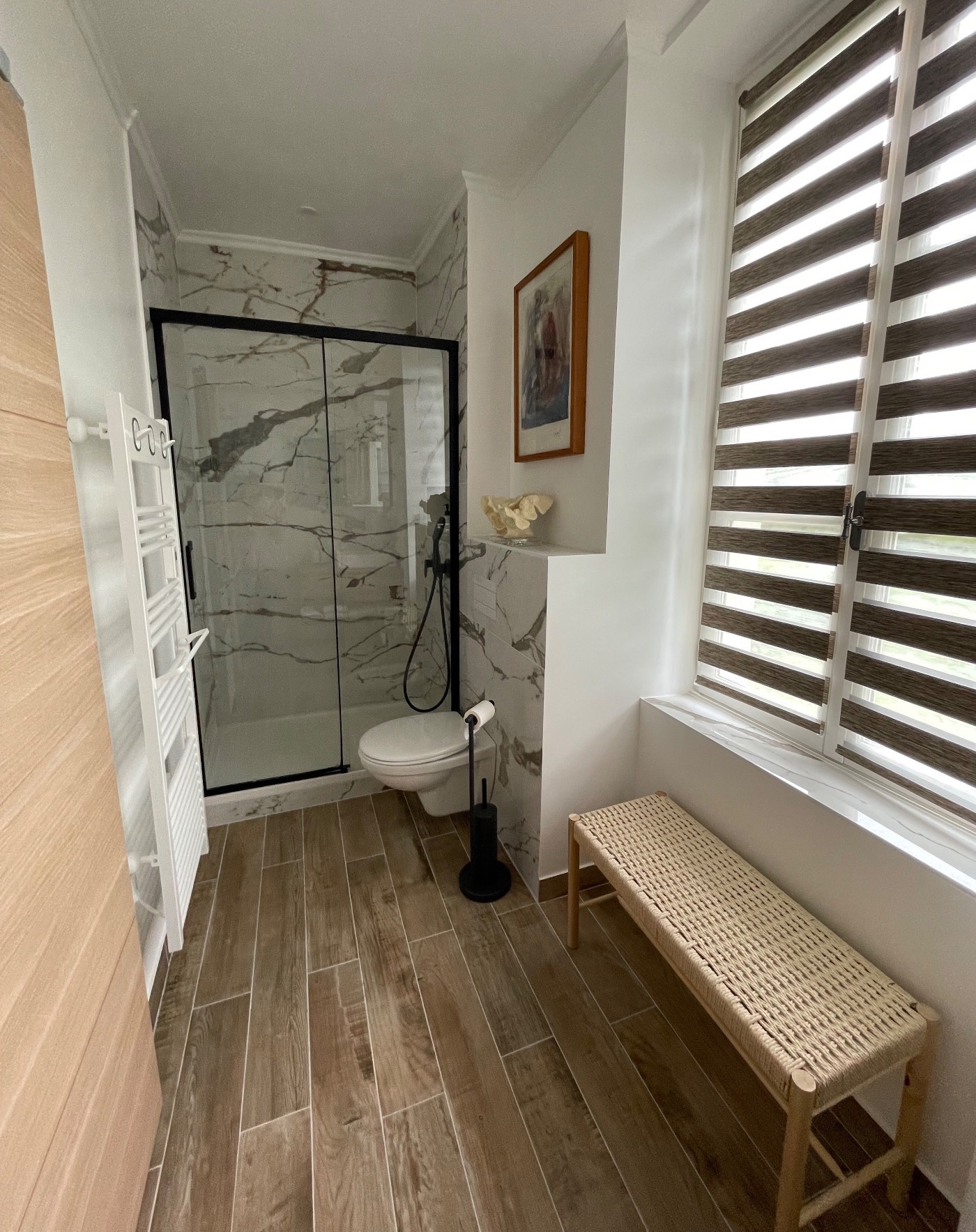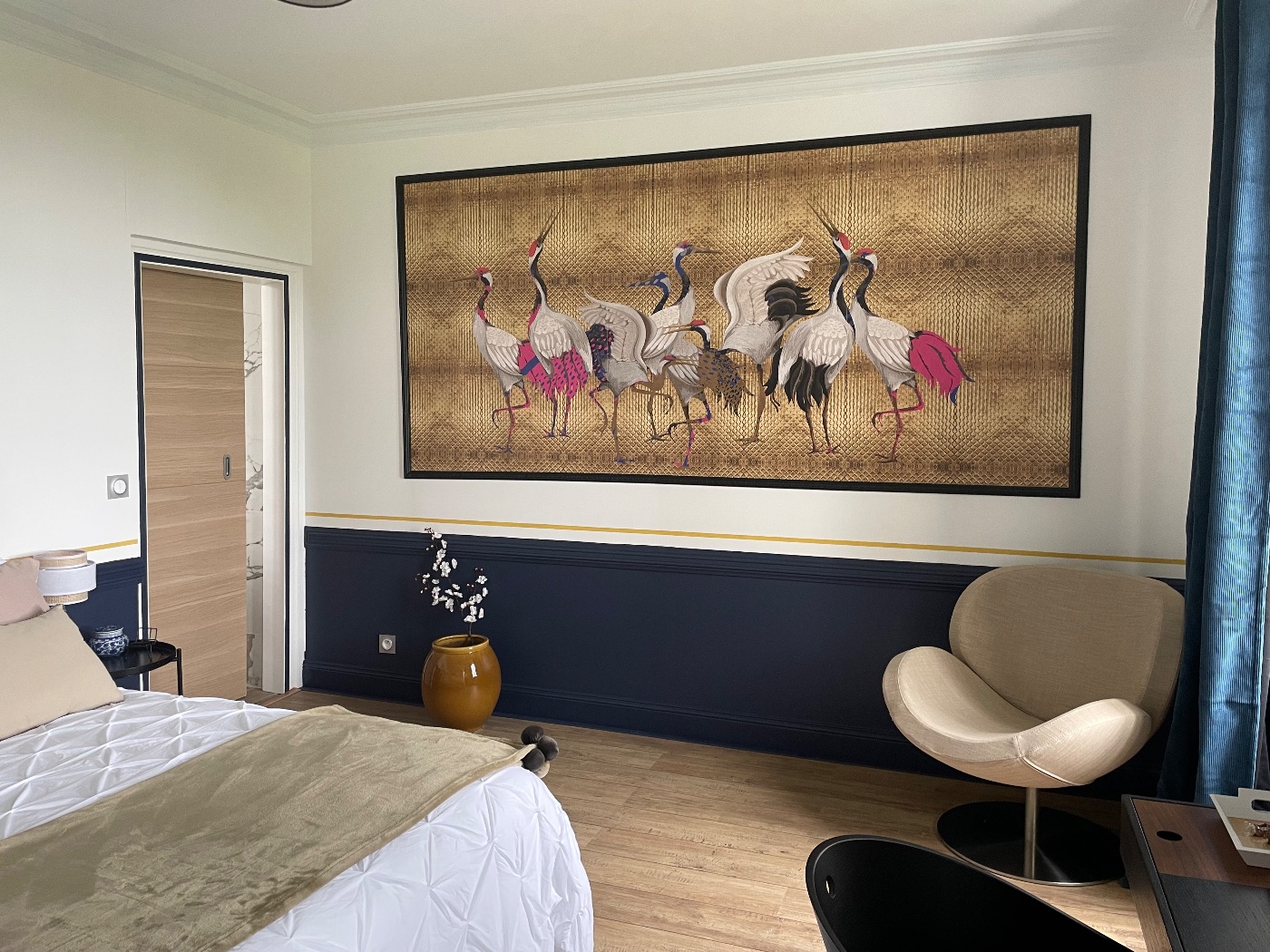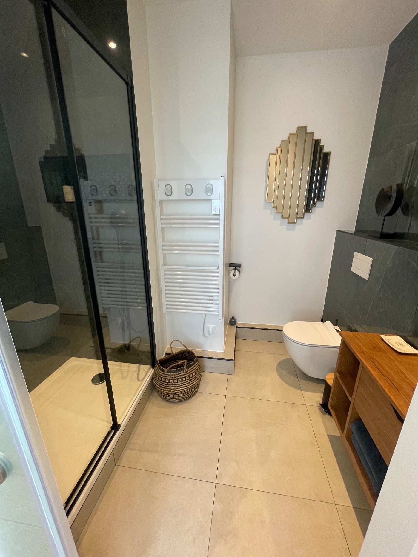 il comporte 3 chambres spacieuses avec bureau, télévision, salle de bain privatise. Un salon est également a la disposition des hôtes, avec café et thé à disposition.