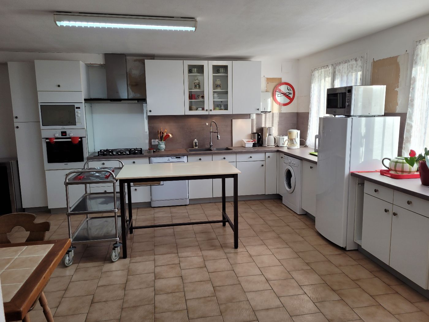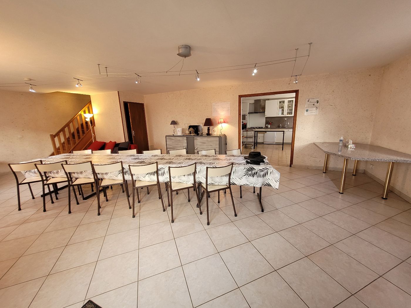 Au RDC, la salle à manger-salon peut accueillir jusqu'à 20 personnes pour manger et elle est équipée d'une télévision. La cuisine se compose de 2 réfrigérateurs, lave-vaiselle, lave linge, four électrique, micro ondes, plaques de cuisson, vaisselle pour 20 personnes et publiphone à pièces puis un WC avec un coin lavabo sous l'escalier. A l'étage 5 chambres toutes équipées d’un meuble lavabo et sur le palier, 2 WC et 3 douches. A l'extérieur petite cour fermée avec barbecue et salon de jardin.