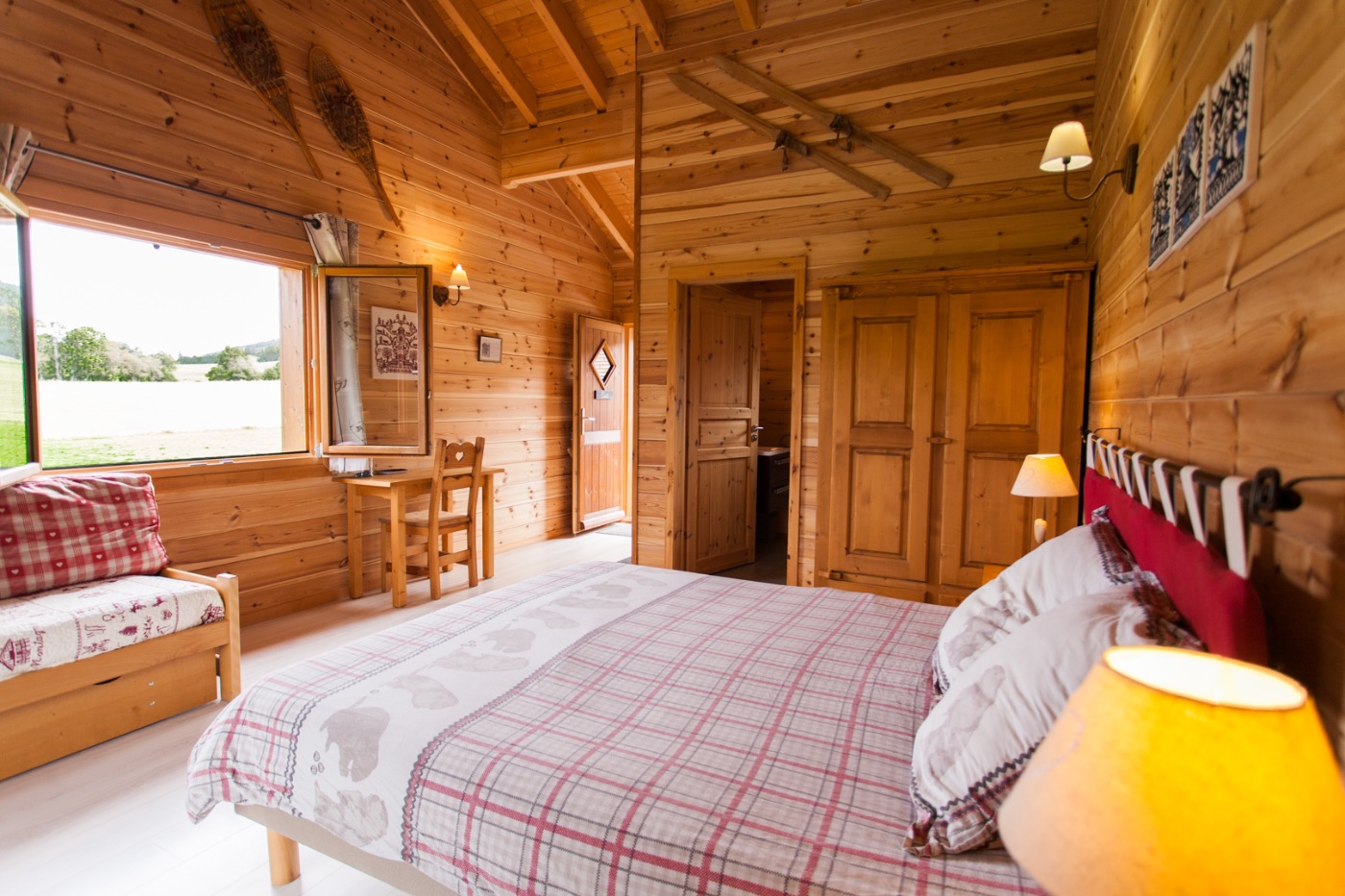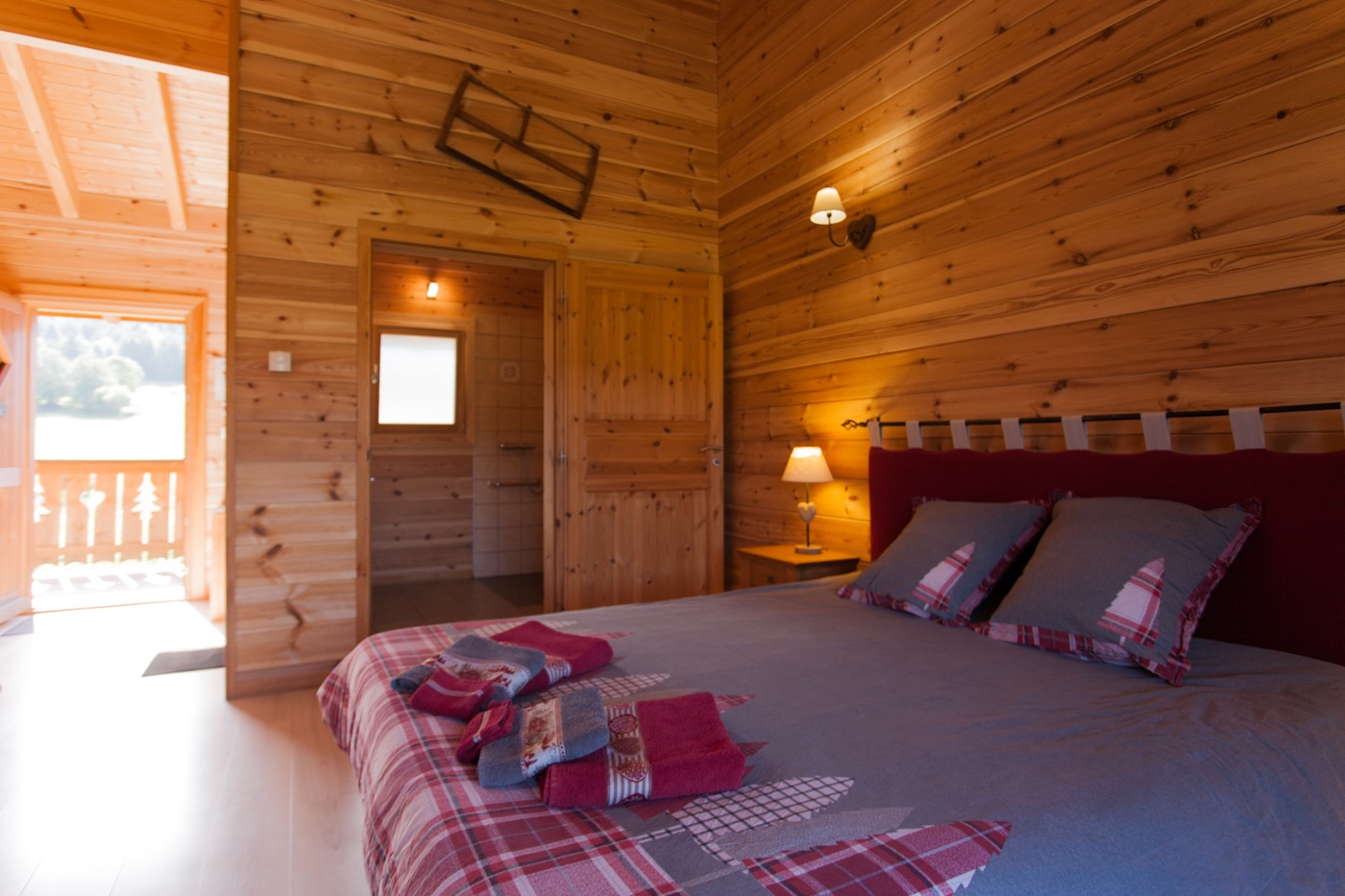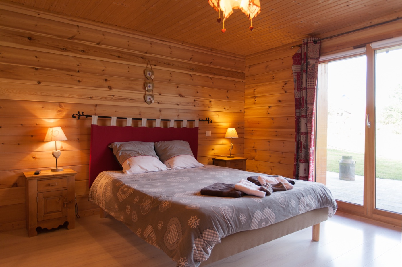 Chambre de 28 m² au volume généreux avec plafond haut sous charpente donnant sur 2 balcons, vue sur la prairie et la forêt.