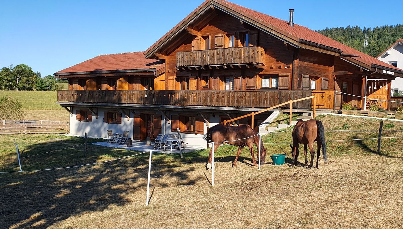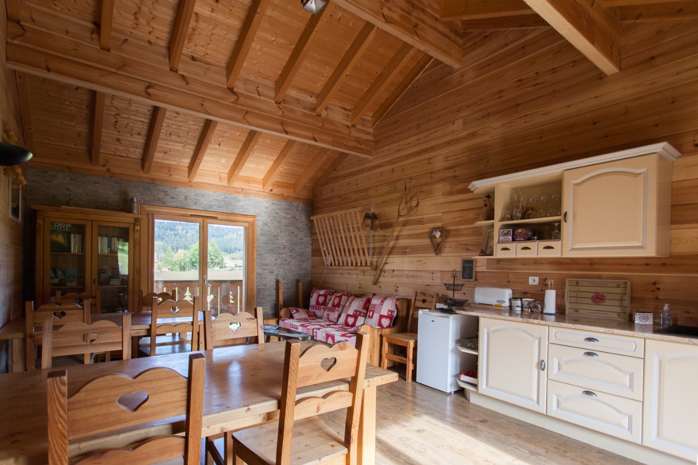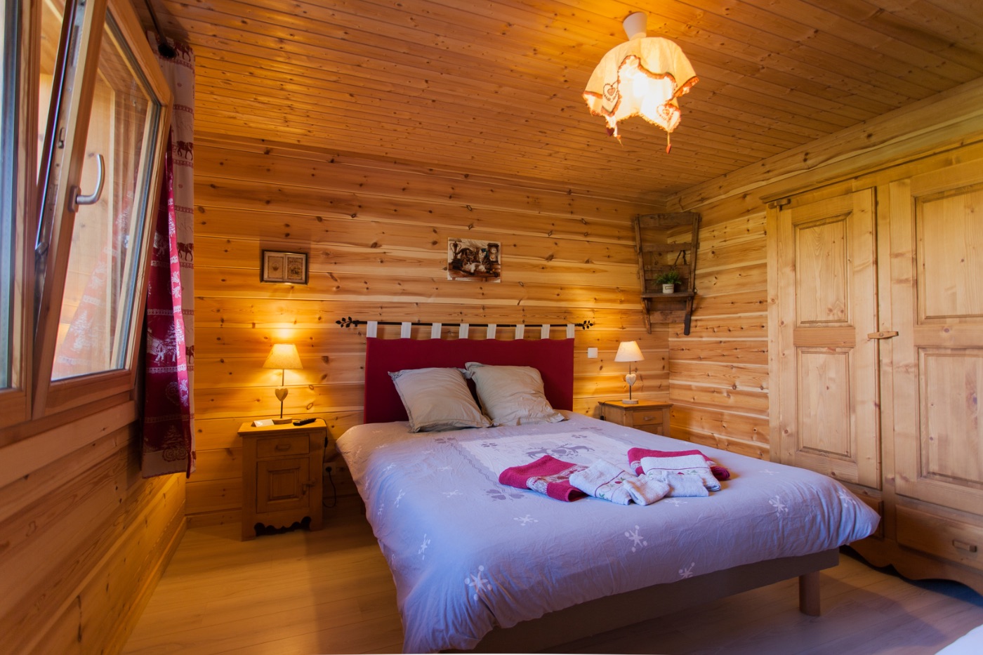 Chambre de 28 m² au volume généreux avec plafond haut sous charpente donnant sur 2 balcons, vue sur la prairie et la forêt.
