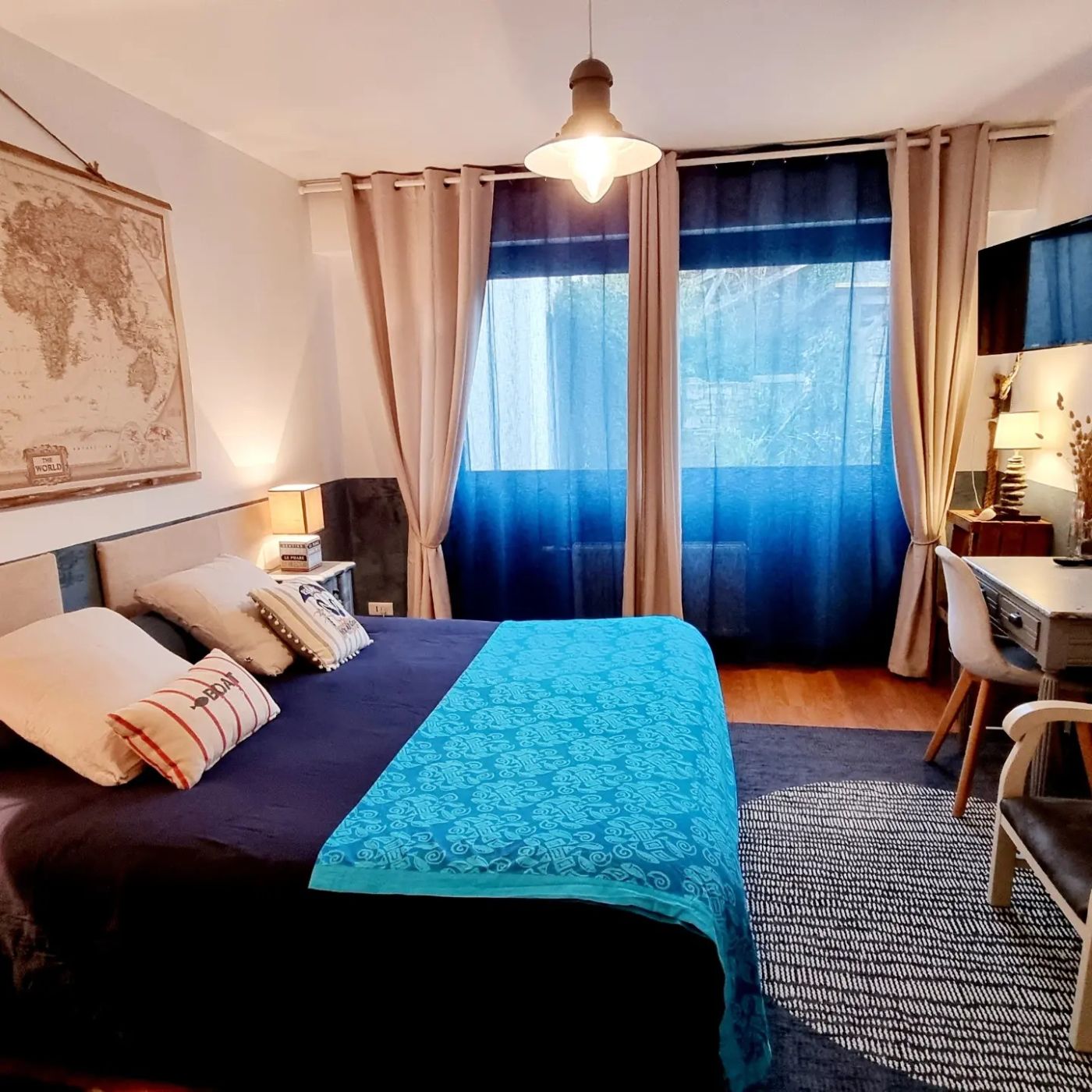 Joliment décorée avec ses poutres azur et ses plantes, c'est un havre de tranquillité.