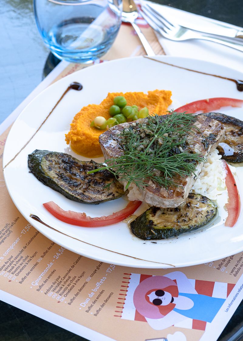 Vous savourerez votre repas au frais dans notre restaurant ou en plein air sur notre terrasse à l'ombre de notre pergola.
