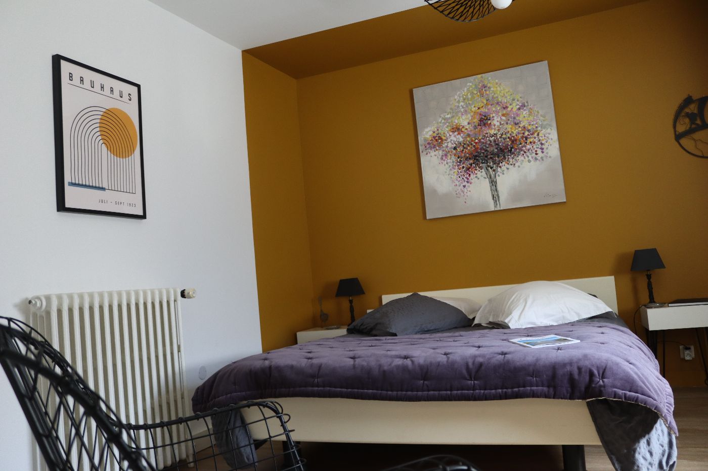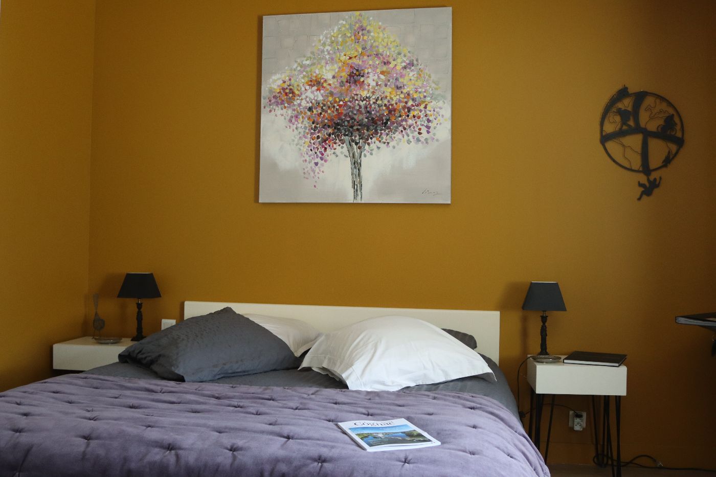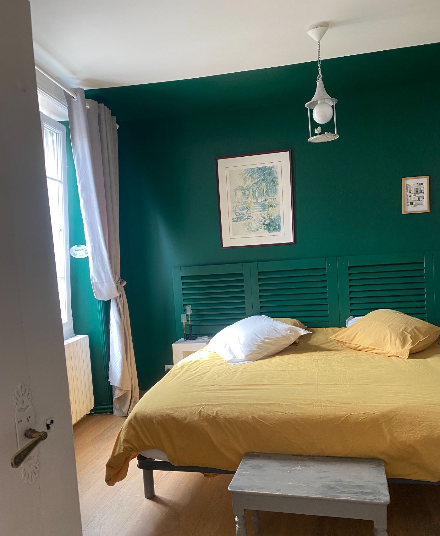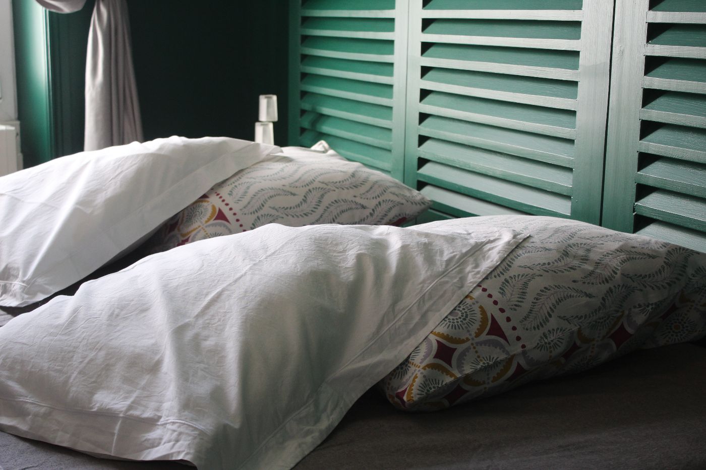 Sa décoration est contemporaine, dans la continuité de la terrasse avec des tons de vert et blanc. Chevets réalisés par une artiste locale.